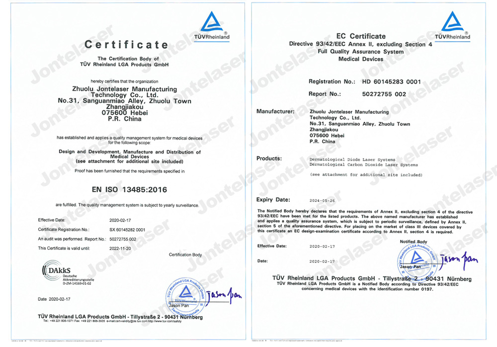 On February 17th we are being approved and issued the CE Medical and ISO13485 certificates by TUV. It suitable for Diode laser hair removal and Fractional CO2 laser machine, meets EU MDD regulations, can be used for registration with the European Ministry of Health